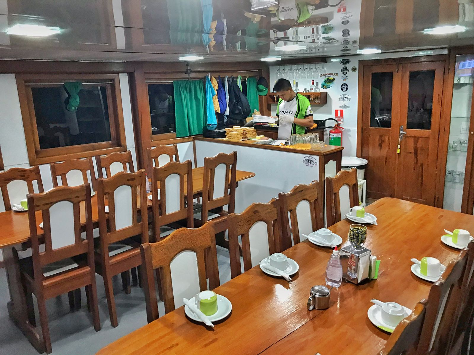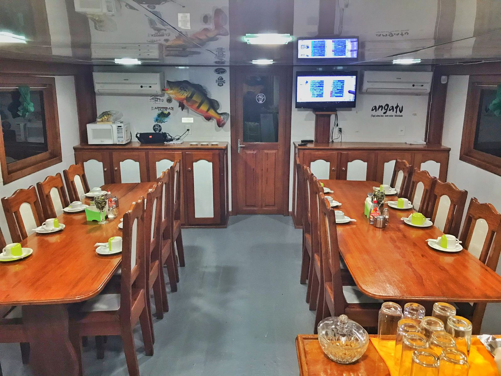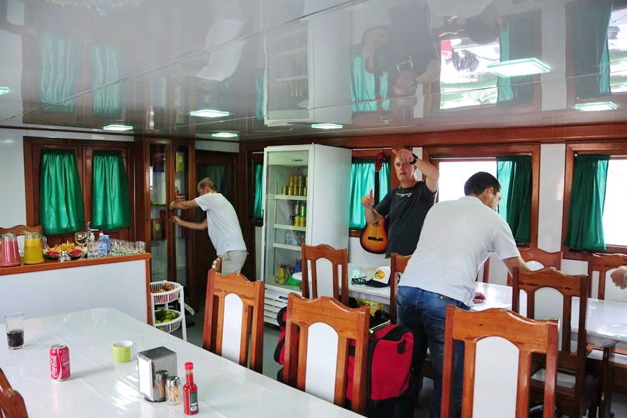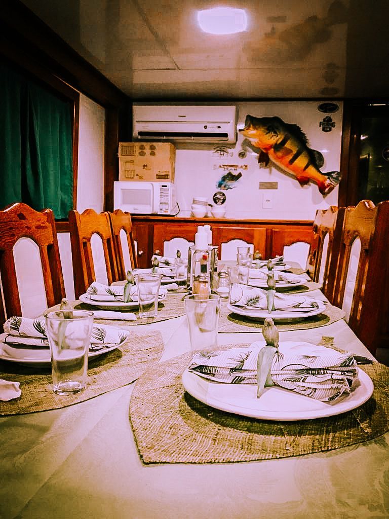 O barco possui ainda salão de jantar climatizado com televisão, dvd e aparelho de som