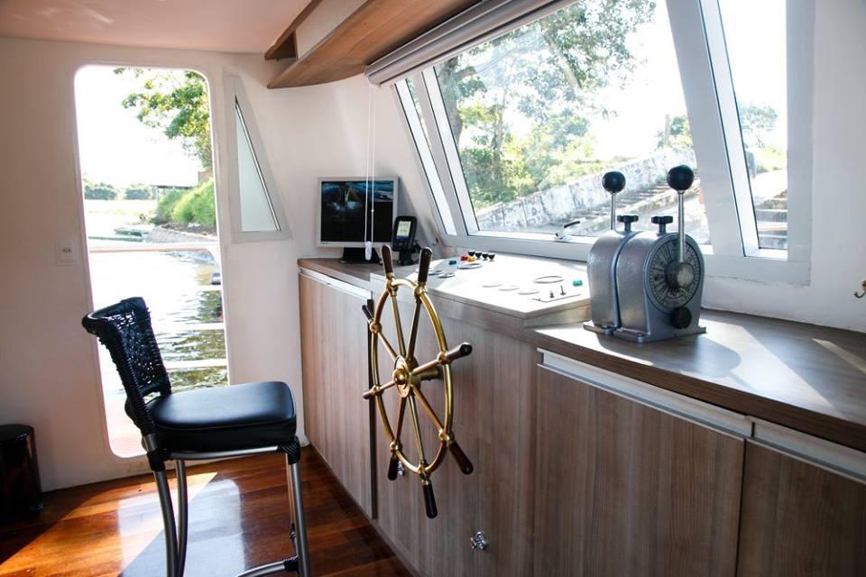 é um navio que possui 25 metros de comprimento por 5 metros de largura, com capacidade para 10 hóspedes, possui 3 conveses que apresenta a seguinte distribuição: