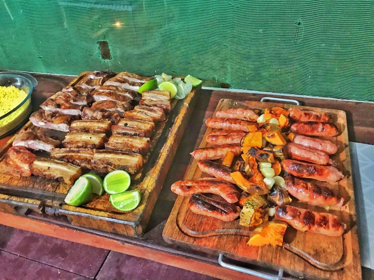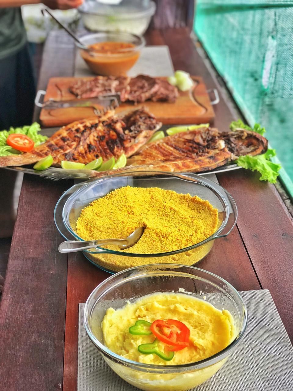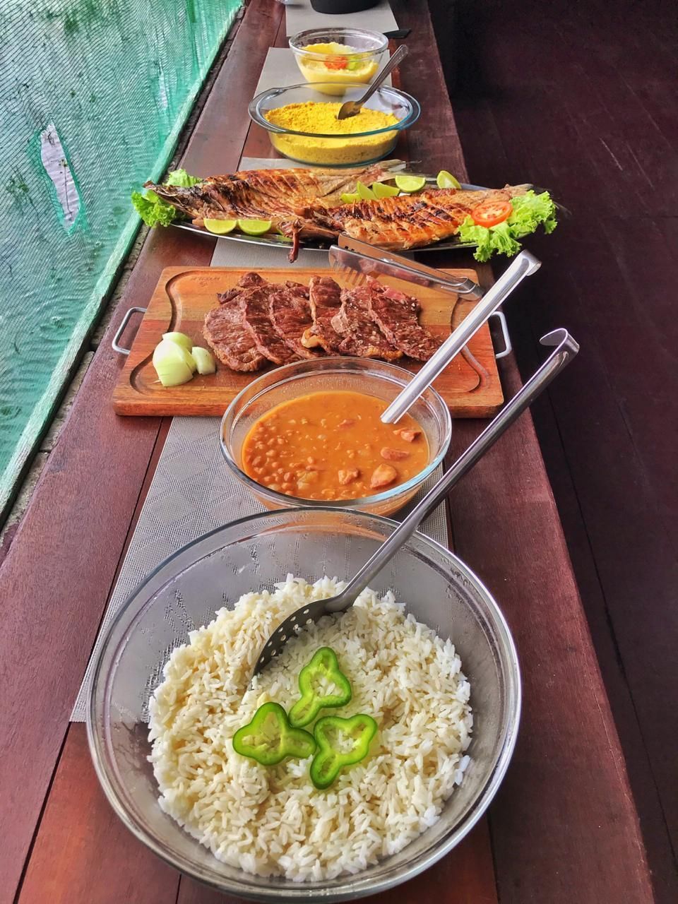 Os almoços serão sempre servidos em nosso ponto avançado no lago próximo aos pontos de pesca, para economizar tempo de navegação e otimizar tempo de pescaria. O grupo sempre levará um kit preparado com guarnições (arroz, feijão, vinagrete, farofa), carne para assar e peixe de cativeiro variando entre (tambaqui e matrinxã).