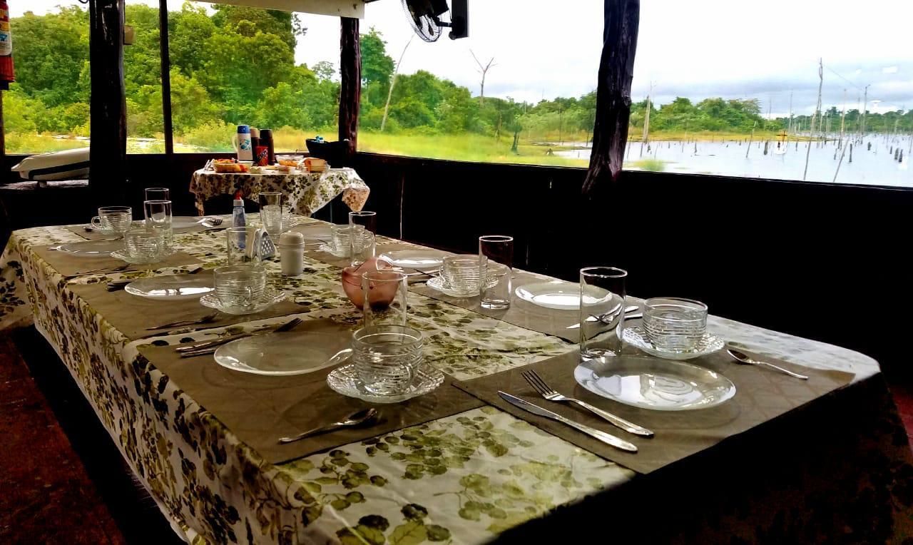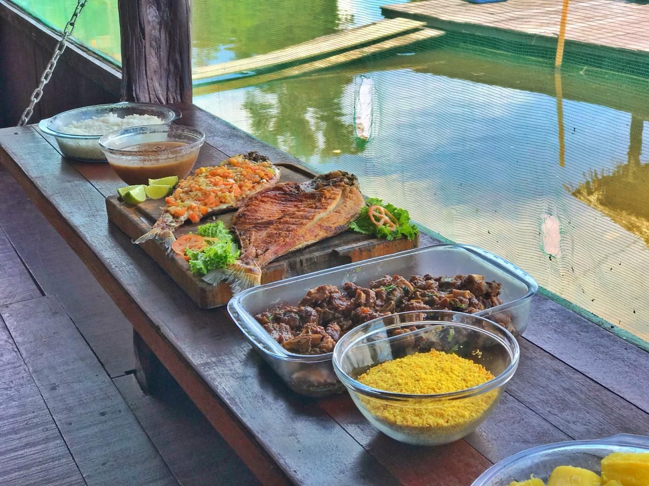 Na Ilha de Caras Lodge o dia começa com um café-da-manhã servido com tapioca, frutas variadas, banana da terra, pães, ovos mexidos e cozidos, presunto e queijo, café, leite e sucos. Junto a isso alguns condimentos para preparo do pão e também do café.