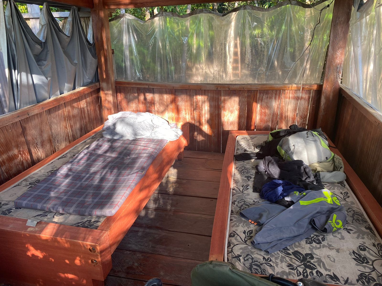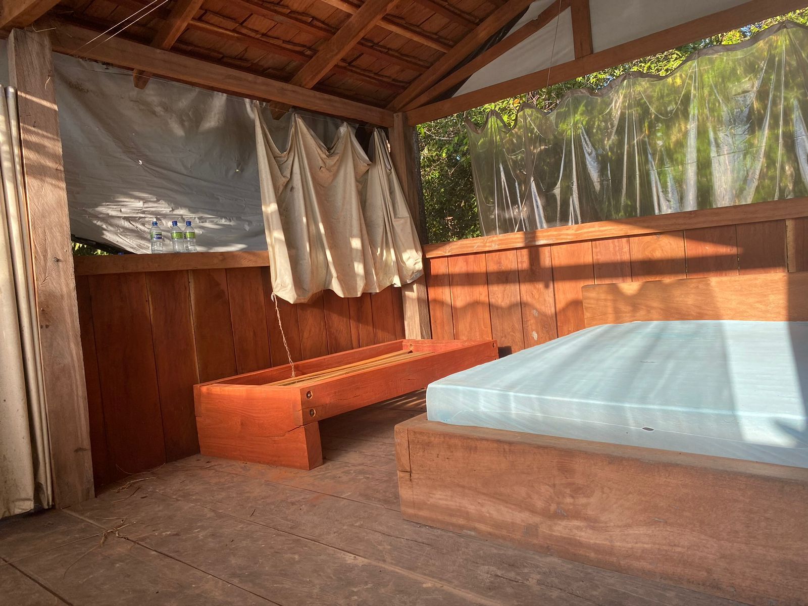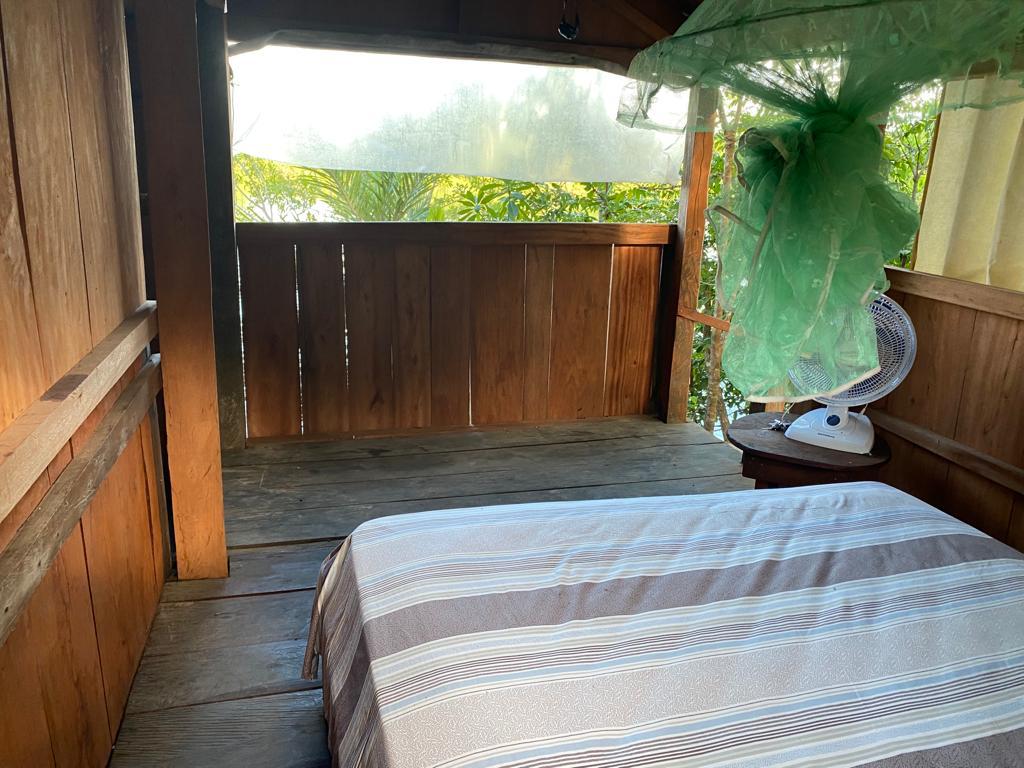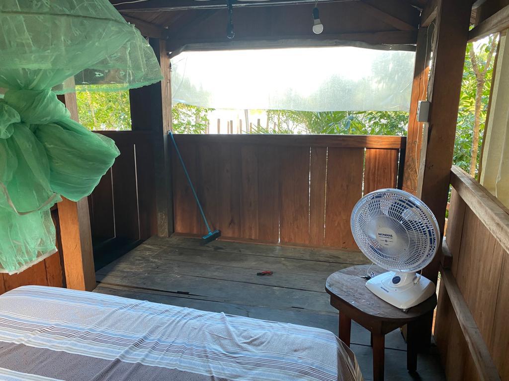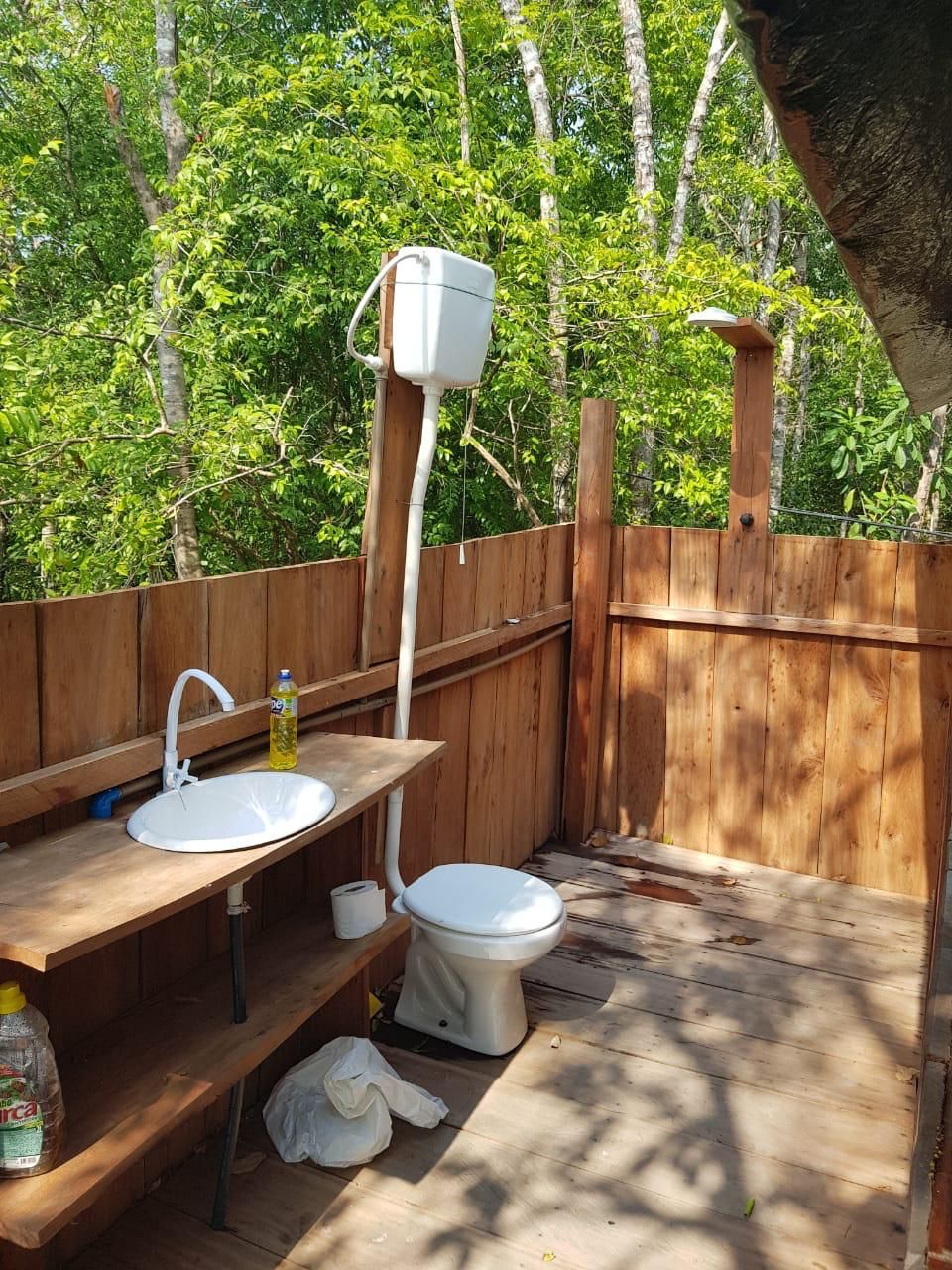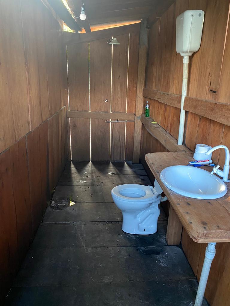 conta com uma estrutura de chalés de madeira com banheiro