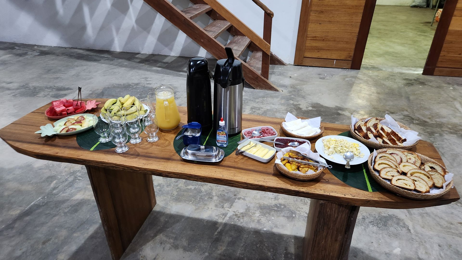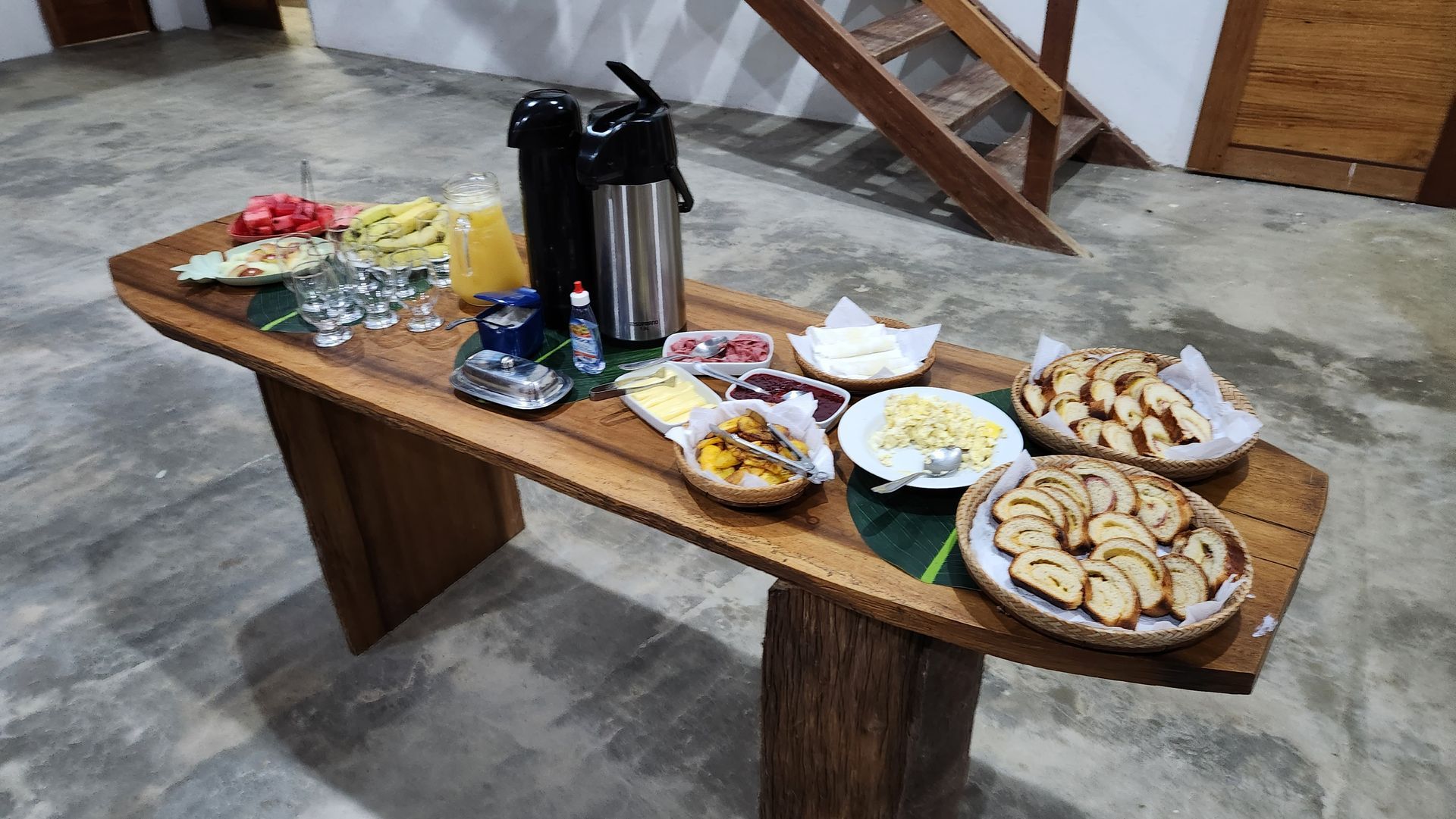 - O café da manhã tem pães e bolo caseiros feitos na hora, manteiga, ovos e frios, além de café, leite e chá de canela (feito da folha colhida no quintal).
