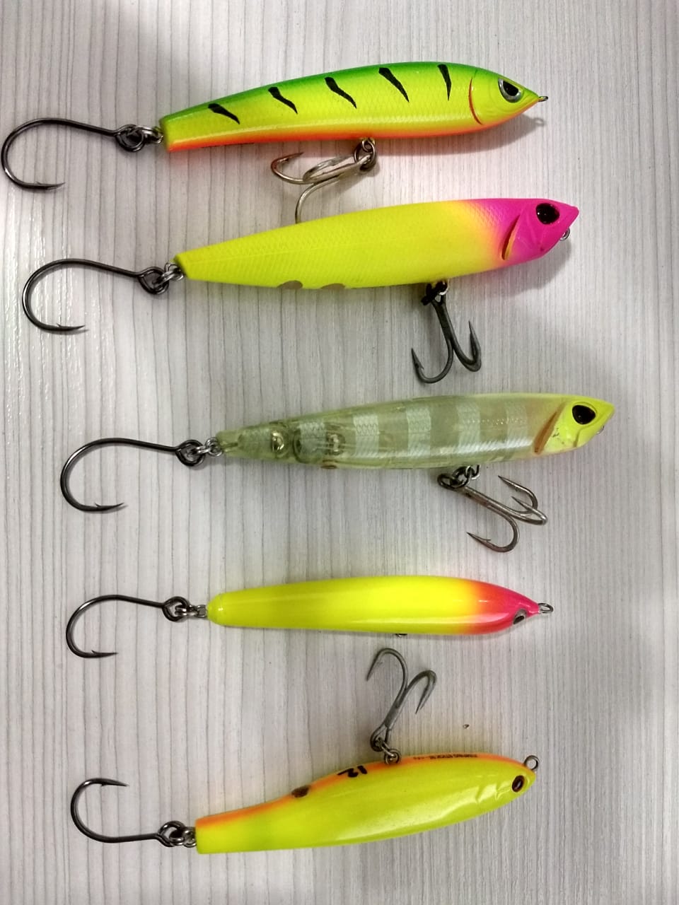 Usamos Araçatubinha de 6 e 9 cm , Sticks e meia água das Iscas da OCL , Borá da Nelsinho Nakamura, E-shad da Monster , etc.